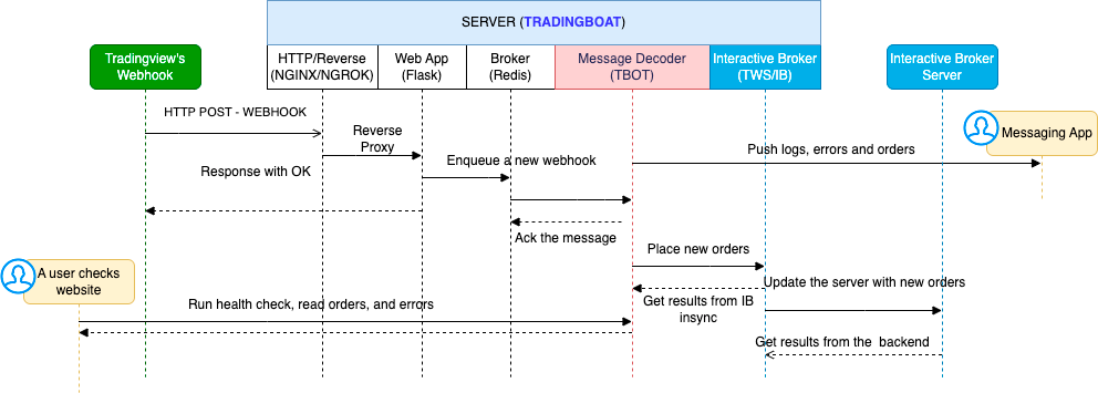 TradingView dispatches alert messages using the HTTPS protocol. To receive these alert messages, the trading bot needs an HTTP server. Upon receiving the alert messages, the trading bot decodes them and places orders with Interactive Brokers accordingly.