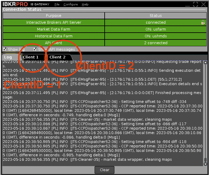 Upon successful connection, you can view the connection status from the IB Gateway. As shown in the following image, two simultaneous connections have been established from TBOT applications.