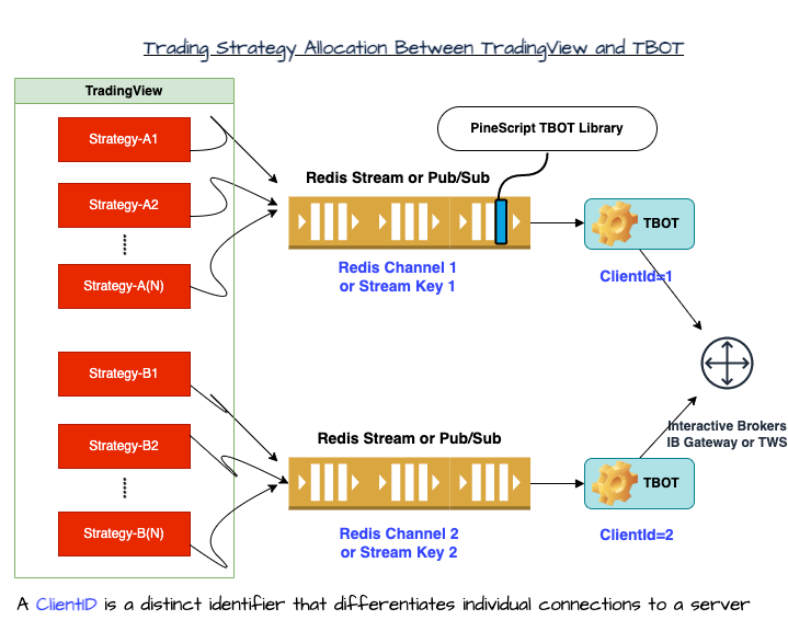 TradingView's PineScript has the capacity to dispatch multiple alert messages tailored to a variety of trading strategies. Each strategy can be earmarked to a unique Redis Pub/Sub channel or a Redis Stream, designated by a specific stream key. A corresponding TBOT, identified by its ClientID, will then subscribe to a particular Redis Channel or Redis Stream. This will establish a connection to Interactive Brokers, facilitated through the same ClientID.