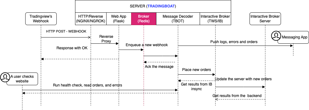 While developing a trading robot that processes webhook messages from TradingView and places orders through the Interactive Brokers (IB) Insync API, I opted to use a message broker - Redis Pub/Sub. This decision stems from the convenience it offers in handling asynchronous operations. The two operations, i.e., receiving webhook messages and placing orders, can function independently, thus increasing efficiency.