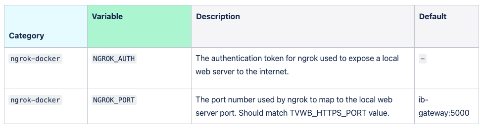 The below environment Variable has 4 categories, such as ib-gateway-docker, TVWB, TBOT and ngrok-docker