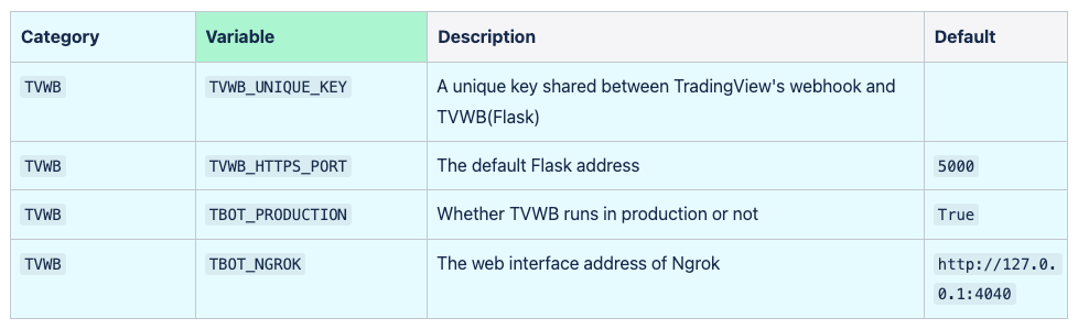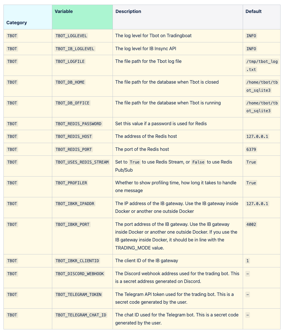 The following table lists the environment variables used by TBOT on Tradingboat, organized by category and variable name.